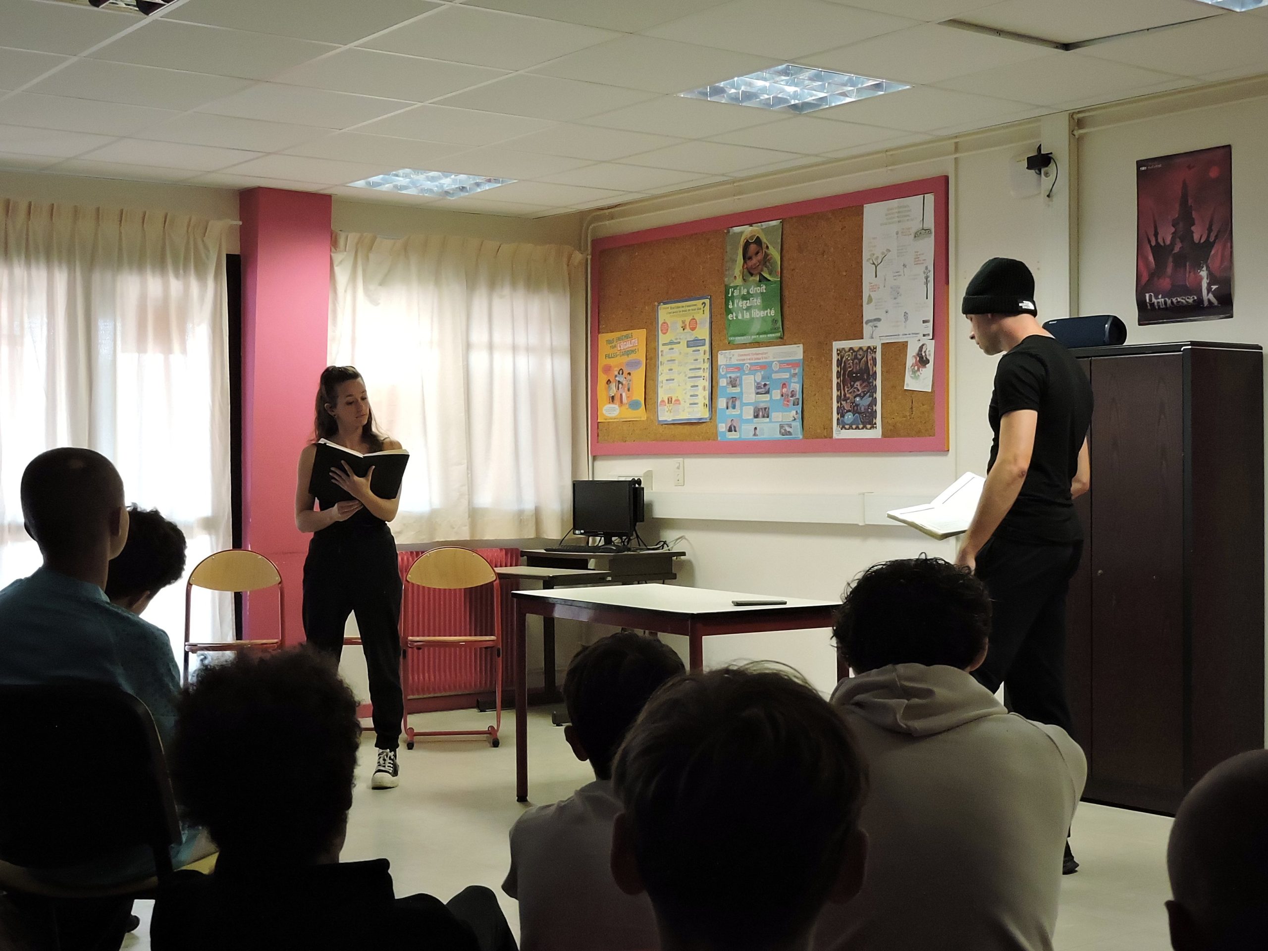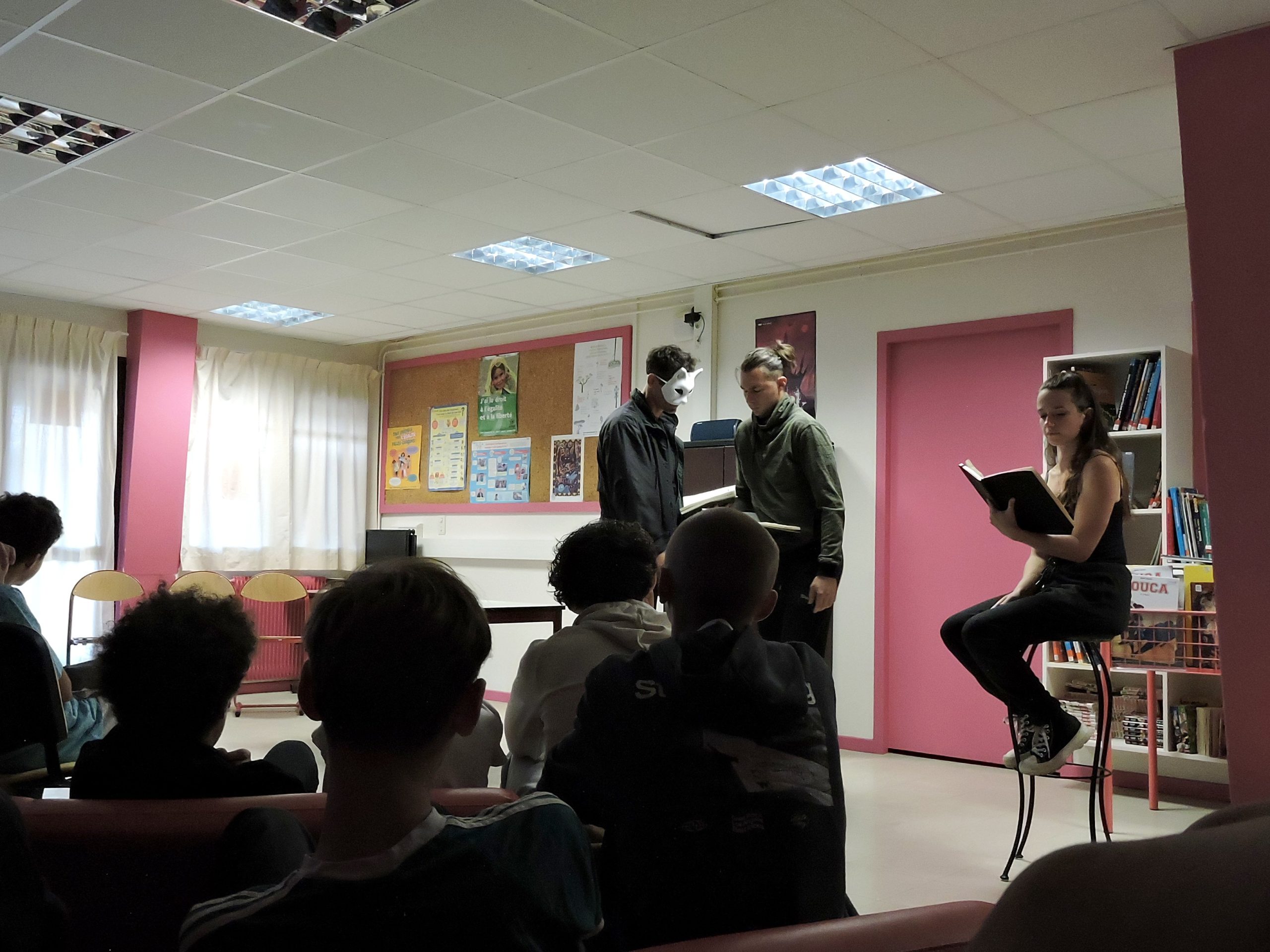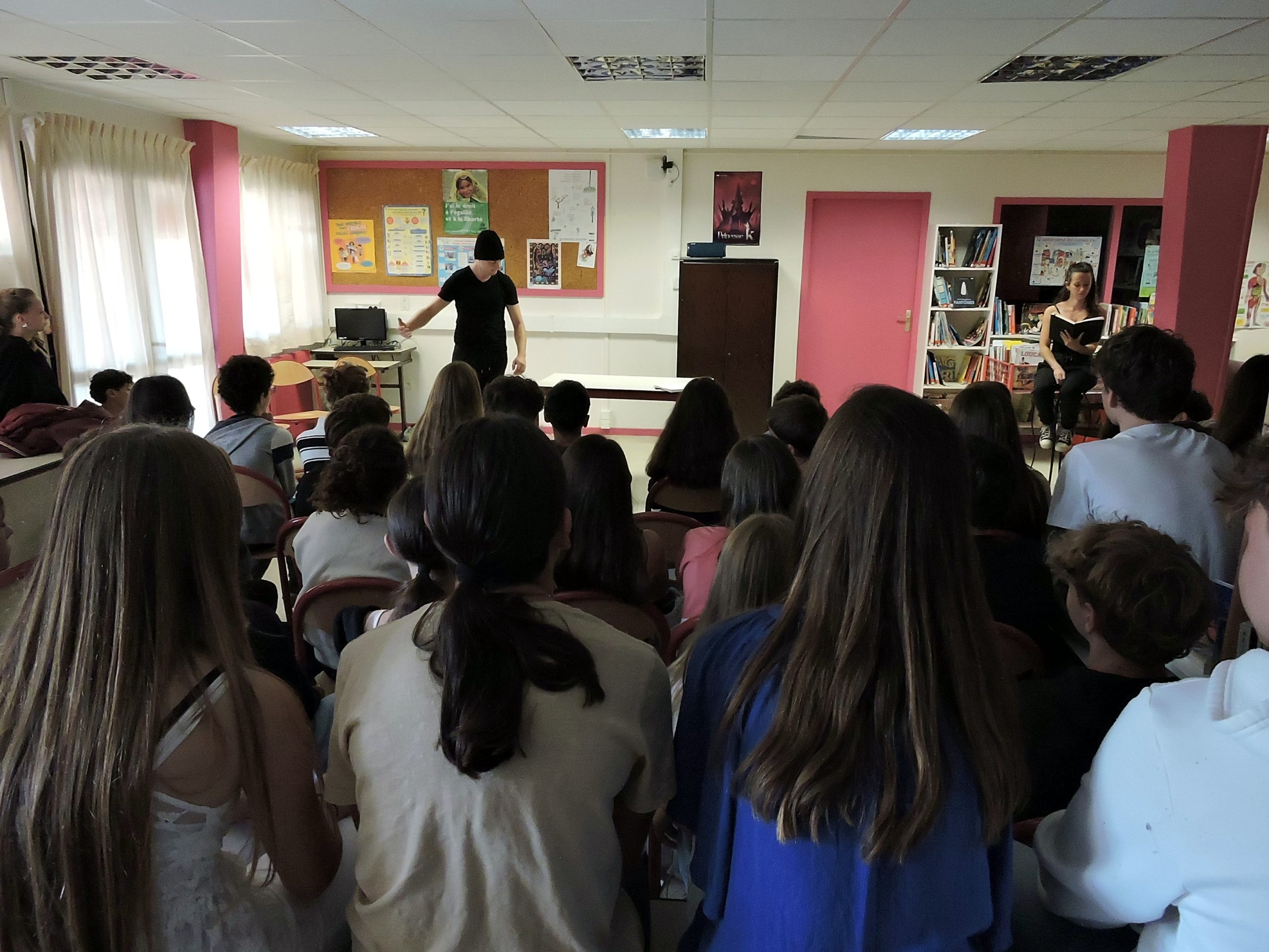 Réunis dans le CDI du collège, les élèves ont suivi avec concentration et émotion, ce spectacle vivant dans lequel l’auteur utilise la fiction pour aborder les mécanismes du harcèlement et de la construction du modèle viril contemporain.