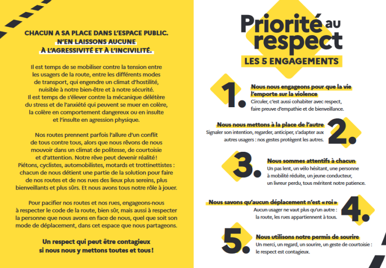 Pour donner corps à ce manifeste et en faciliter l’appropriation par tous, il se décline en cinq engagements simples et concrets que chaque usager peut adopter. Ils viennent souligner que le respect ne se limite pas à l’observation du code de la route : il se nourrit aussi de la considération mutuelle entre tous les usagers.