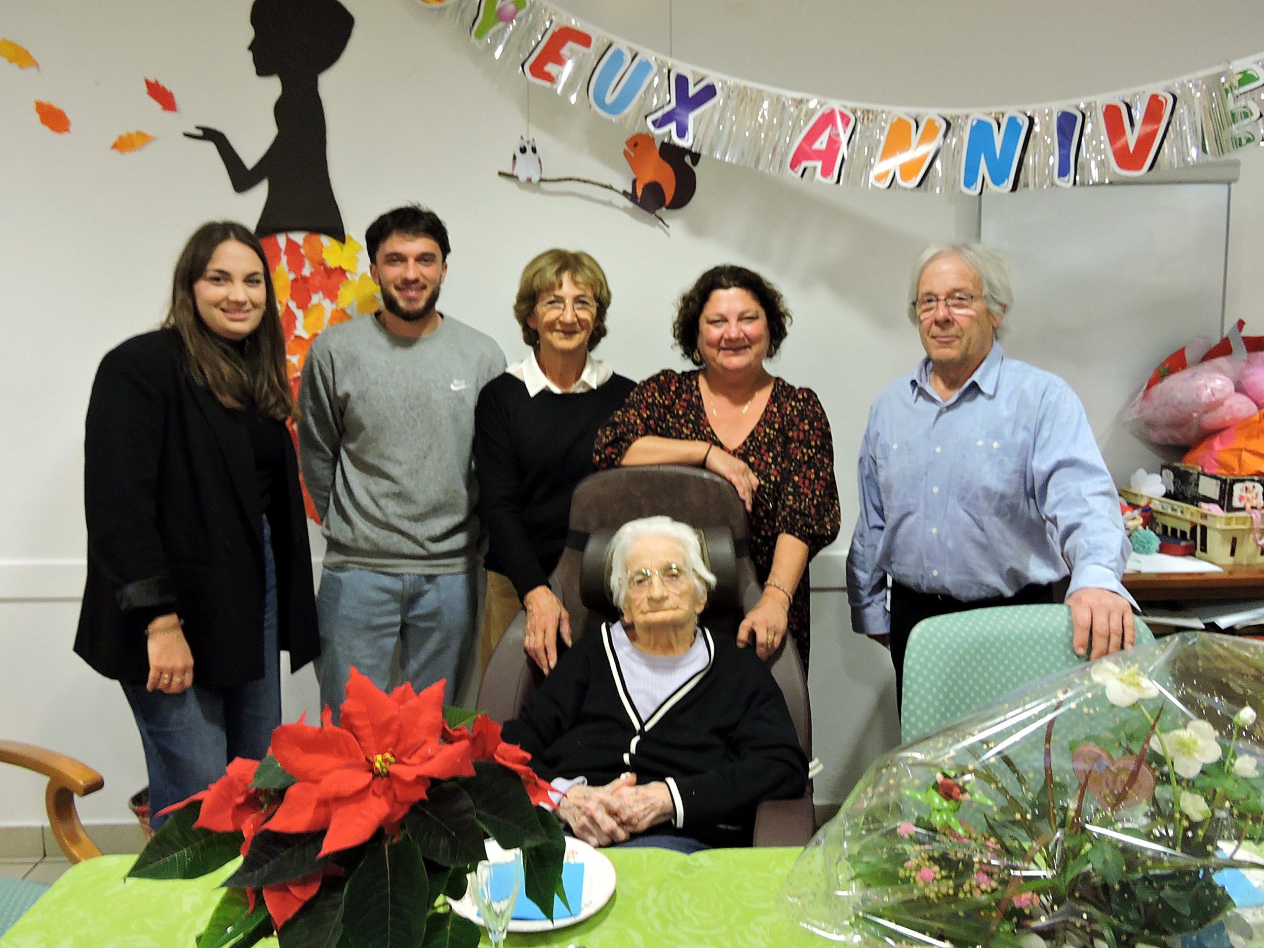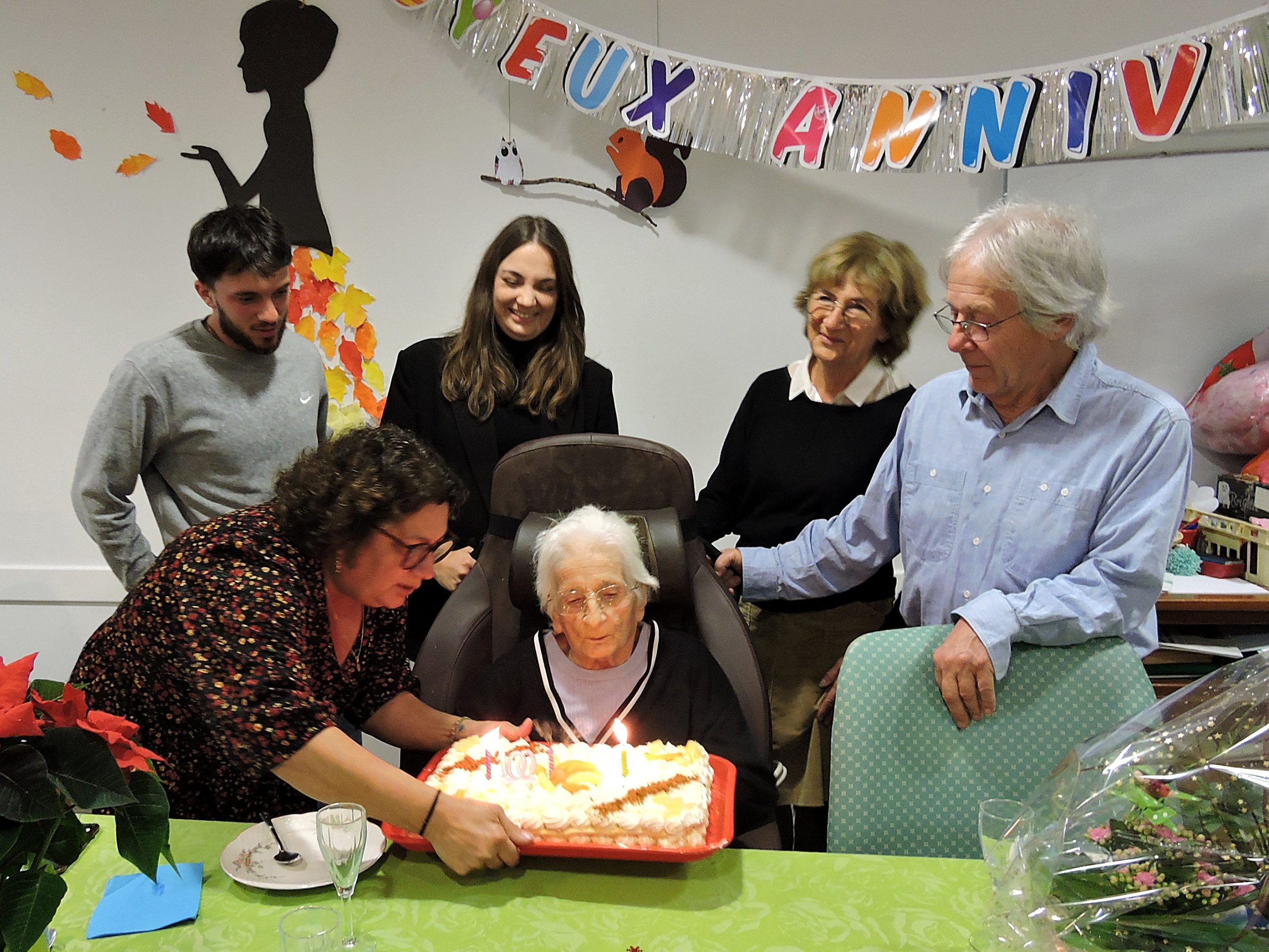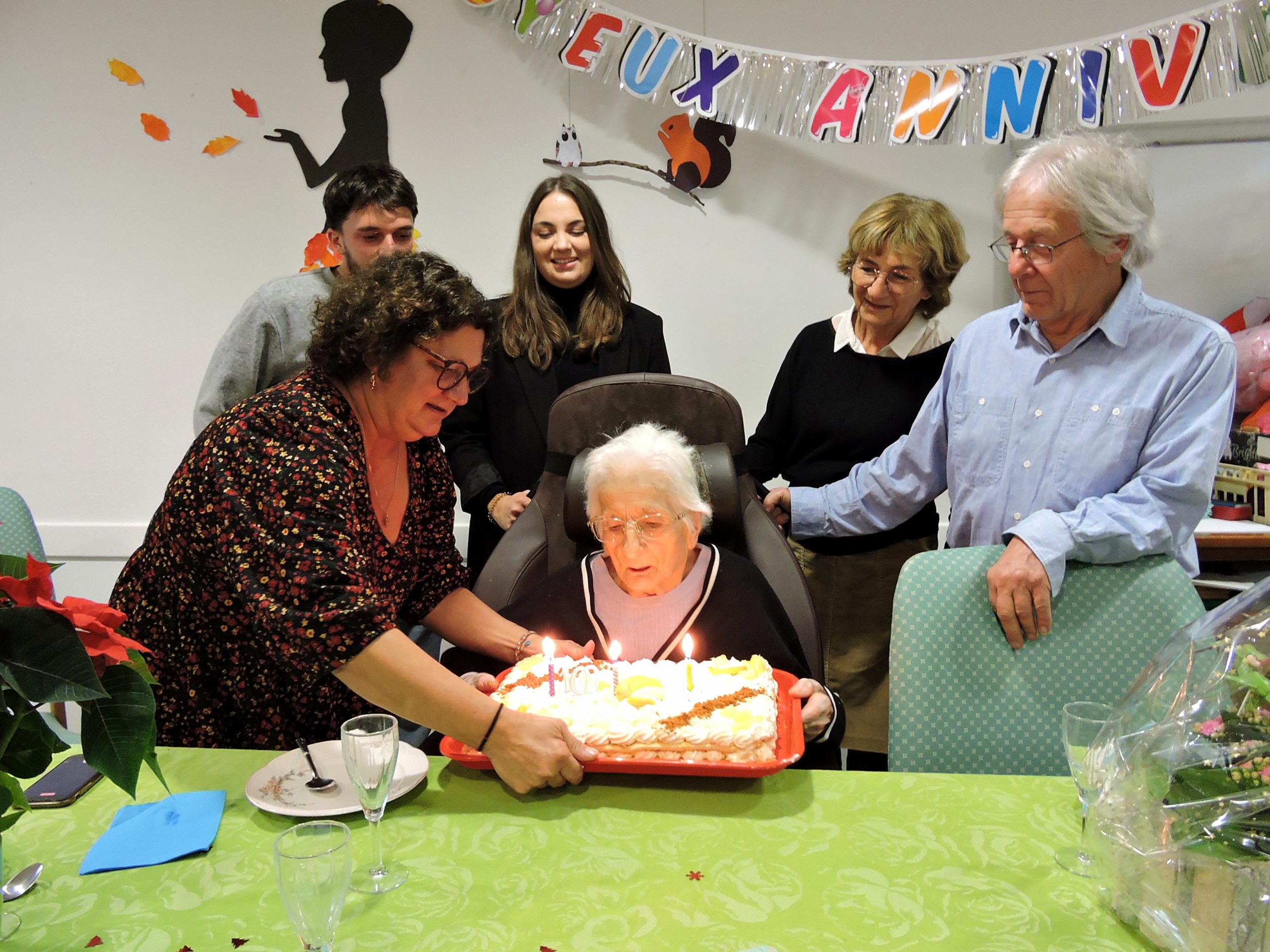 À l’occasion de son centenaire, elle a soufflé vaillamment les bougies et dégusté sa part de gâteau, entourée de sa famille, sa fille, sa petite-fille et ses deux arrière-petits-enfants.