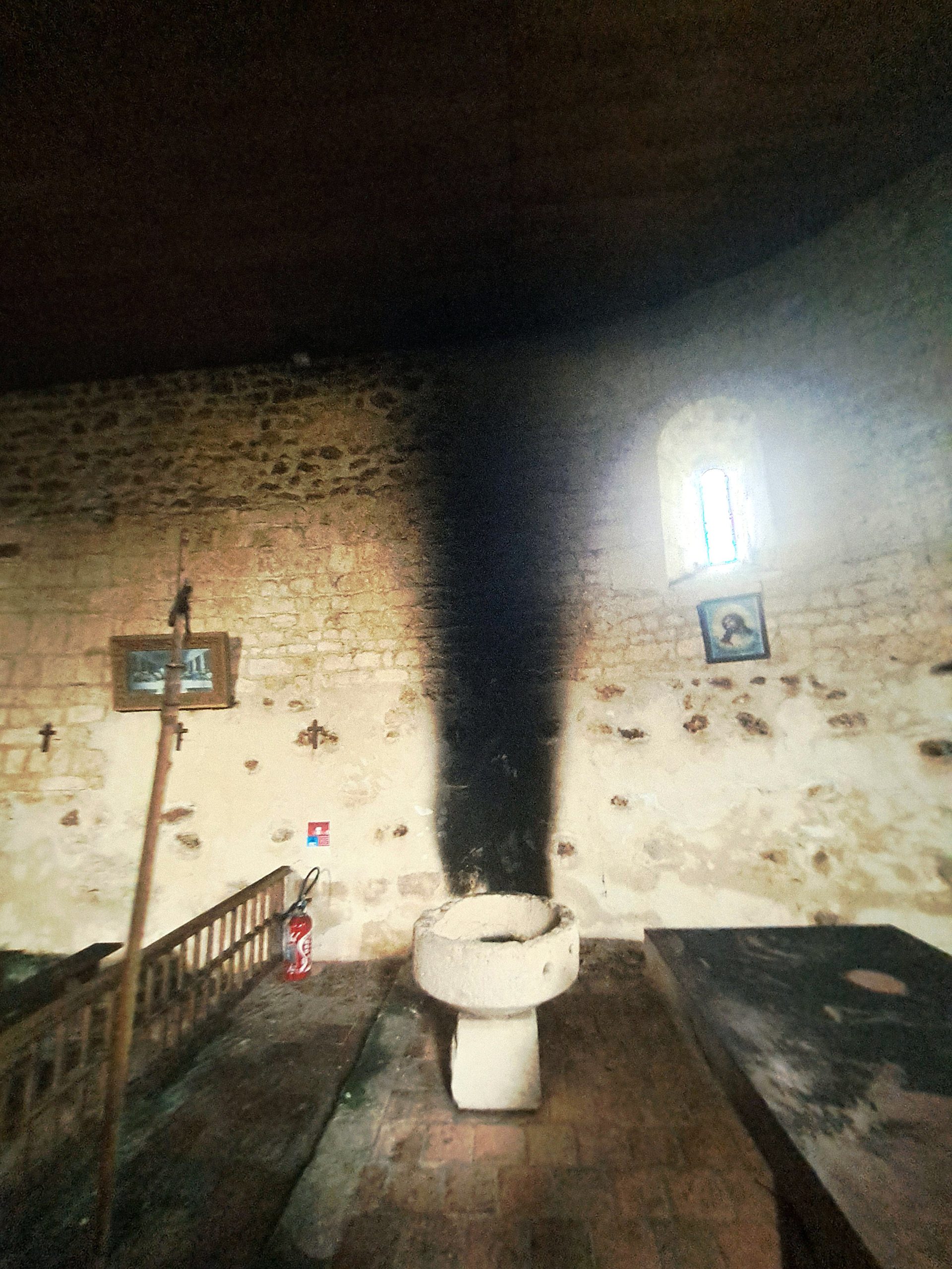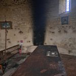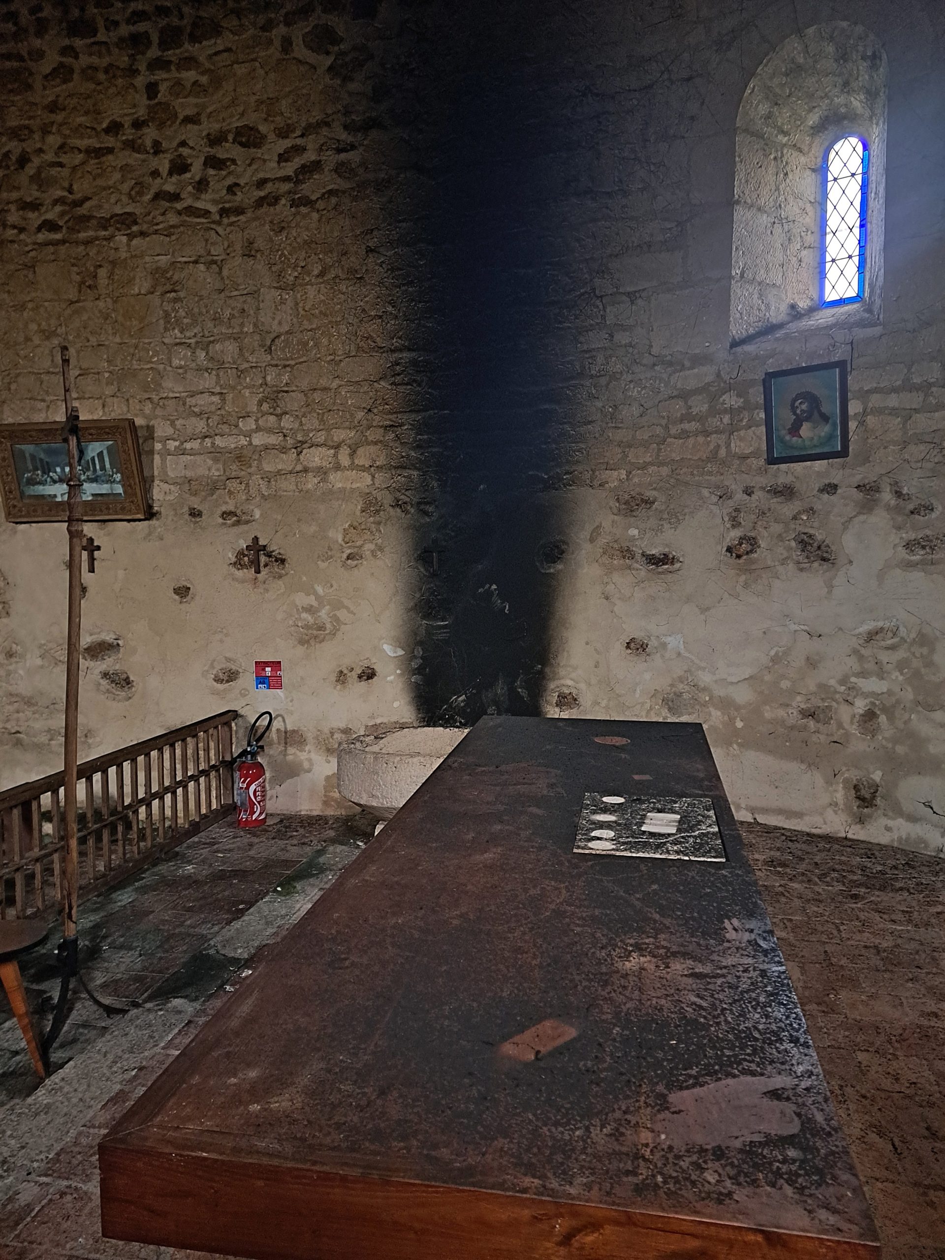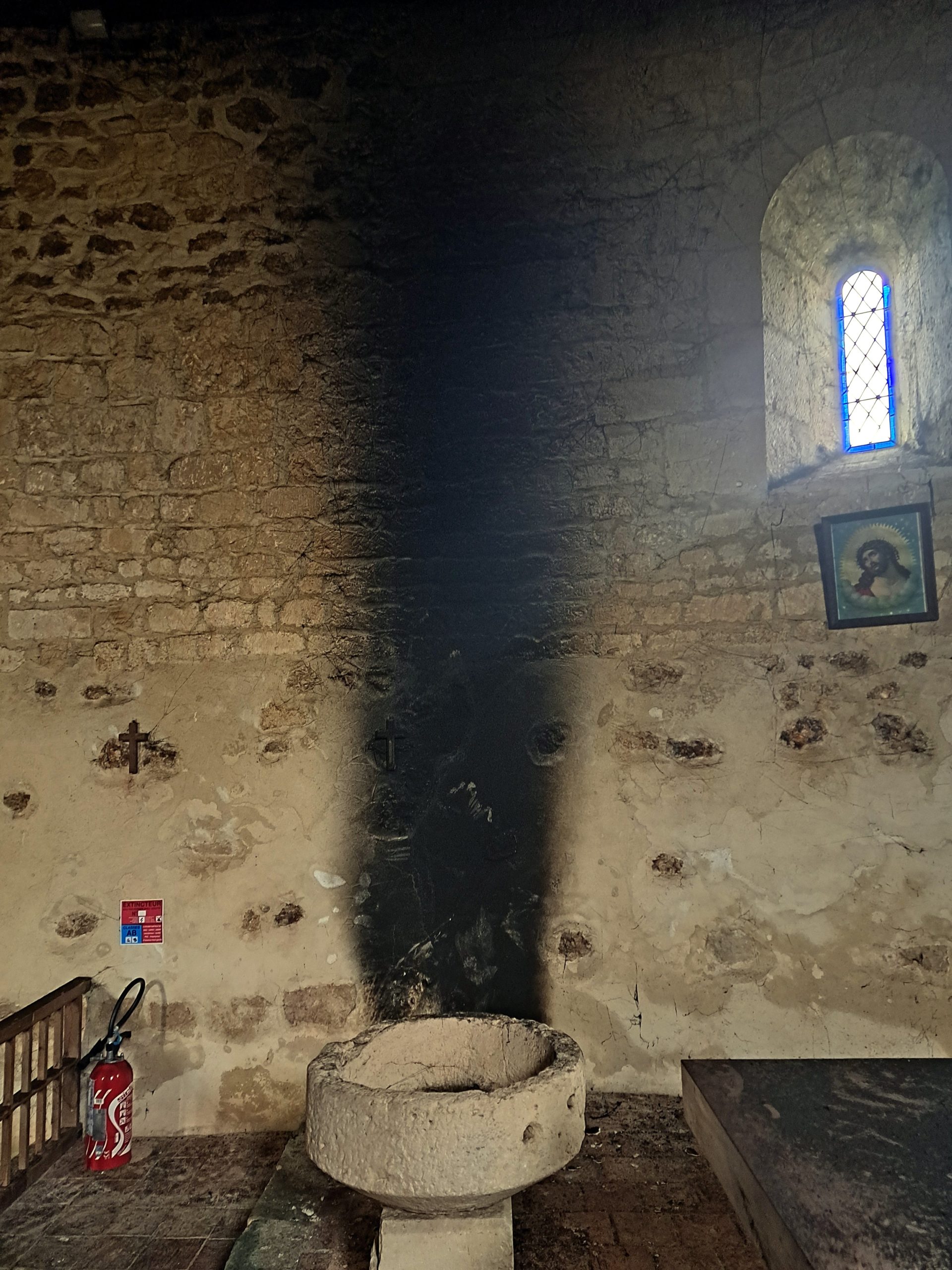 Mais la fumée importante, piégée à l’intérieur, a déposé énormément de suie dans tout l’édifice : murs, autel, vitraux sont dégradés !