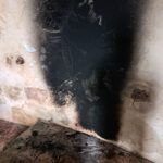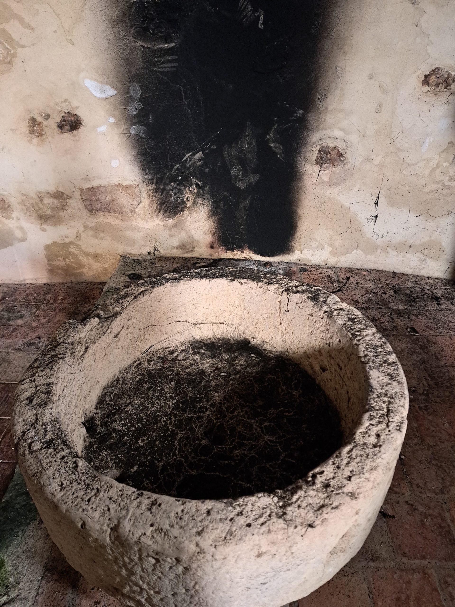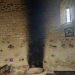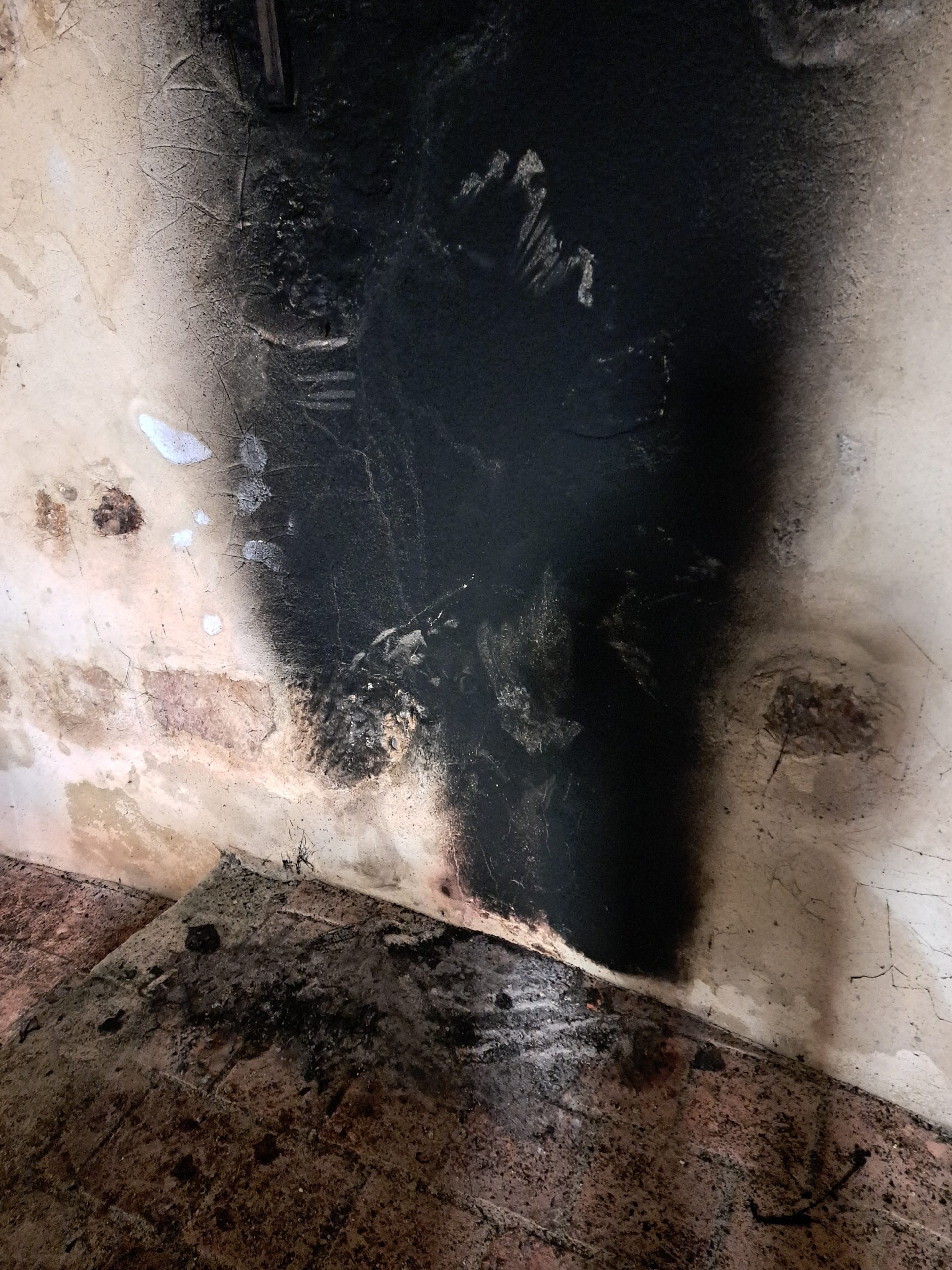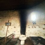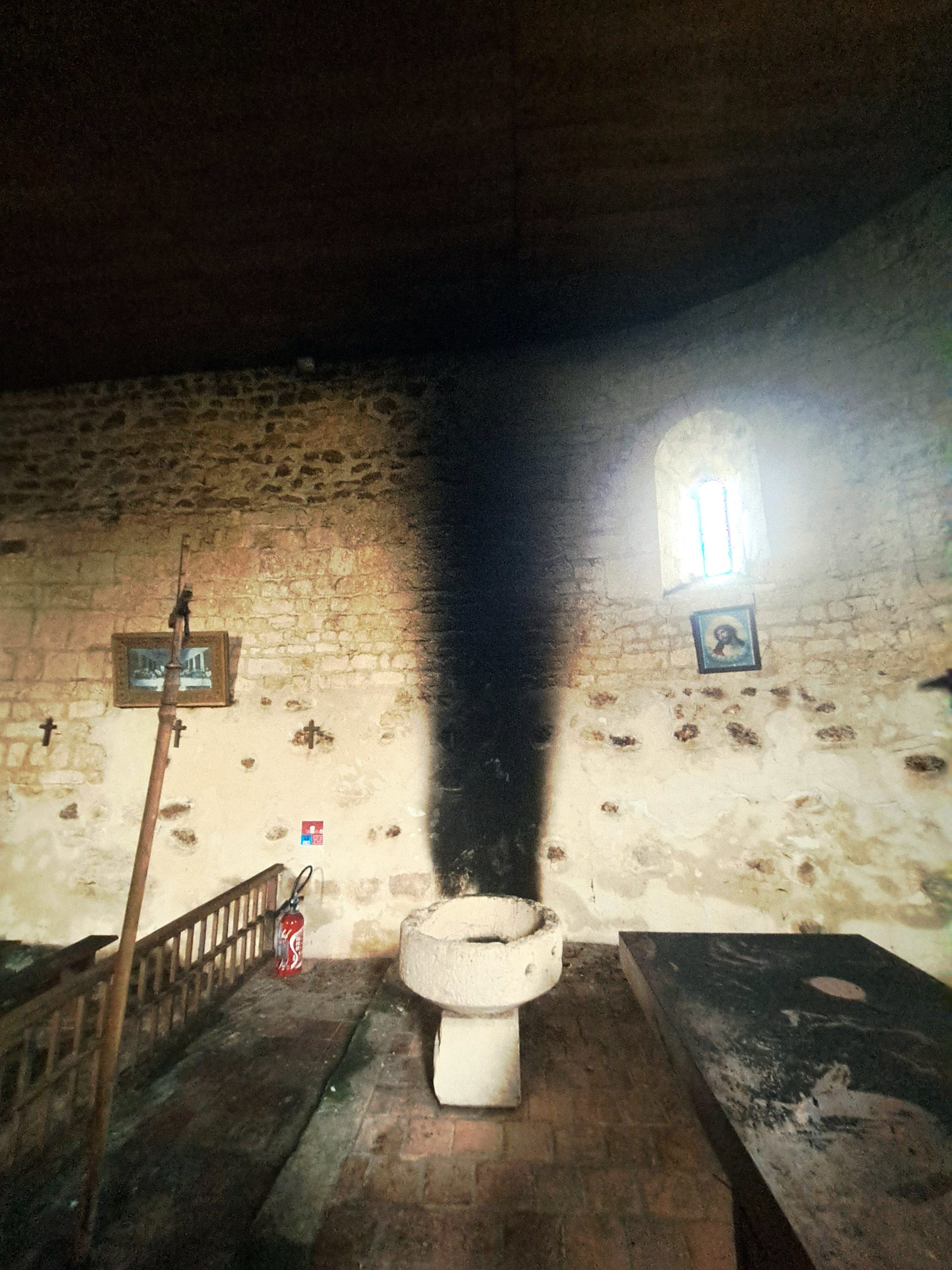 Mais la fumée importante, piégée à l’intérieur, a déposé énormément de suie dans tout l’édifice : murs, autel, vitraux sont dégradés !