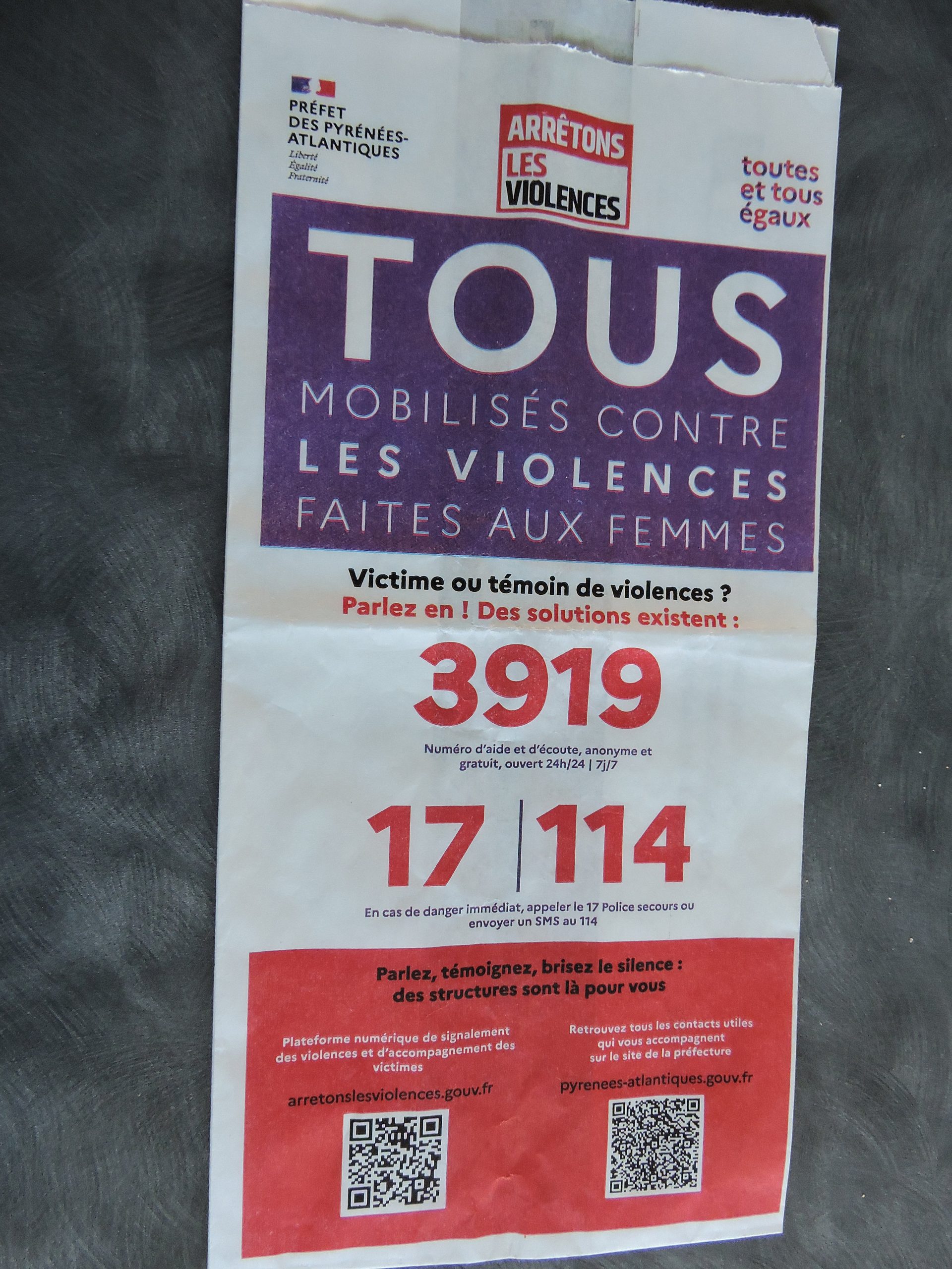 Ces sacs distribués aux clients présentent le violentomètre, outil d’auto-évaluation permettant d’identifier le niveau d’exposition aux violences, ainsi qu’un QR code donnant accès à l’ensemble des numéros d’aide utiles, locaux et nationaux.