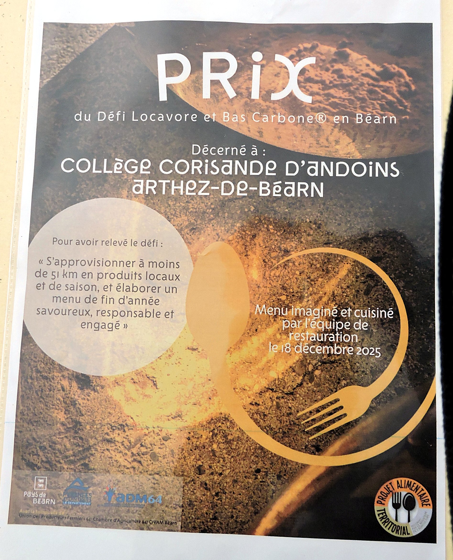 « Le défi consistait, explique Odile Pastre Beaubeau la secrétaire générale d’EPLE (Établissement public local d’enseignement), à concevoir un repas de fin d’année avec toutes les denrées, même les condiments, issues d’un rayon de 50 km maximum et avec une empreinte carbone inférieure à 1,6 kg de CO2/personne : c’est le seuil à respecter selon les accords de Paris sur le climat signés à la COP21 il y a tout juste dix ans. Le calcul de l’empreinte carbone a pu être réalisé avec l’outil Agribalyse. »