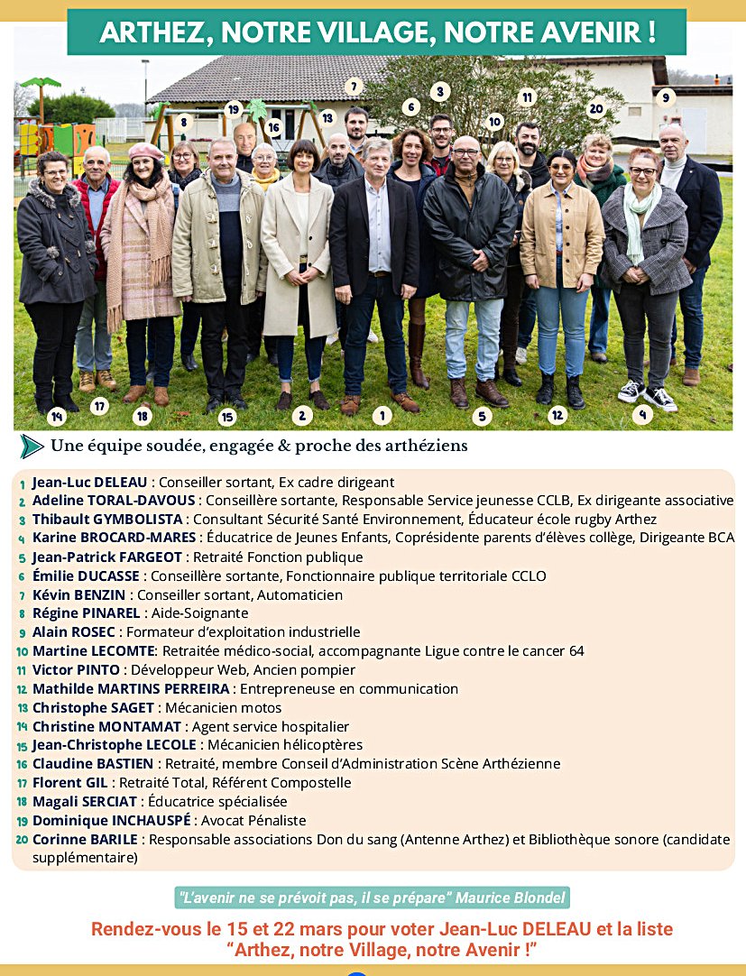 Jean-Luc Deleau a profité de ce « moment fort qui symbolise la véritable entrée opérationnelle en campagne » pour présenter sa liste, constituée exceptionnellement de 20 membres (et non 19), comme le code électoral l’autorise. « C’est une équipe sans étiquette ni esprit partisan, précise la tête de liste, qui réunit des gens différents mais complémentaires, très divers par l’âge (de 25 à 73 ans), le milieu socioprofessionnel ou l’histoire personnelle, représentative de la population arthézienne, du village, de ses quartiers, de ses associations ».