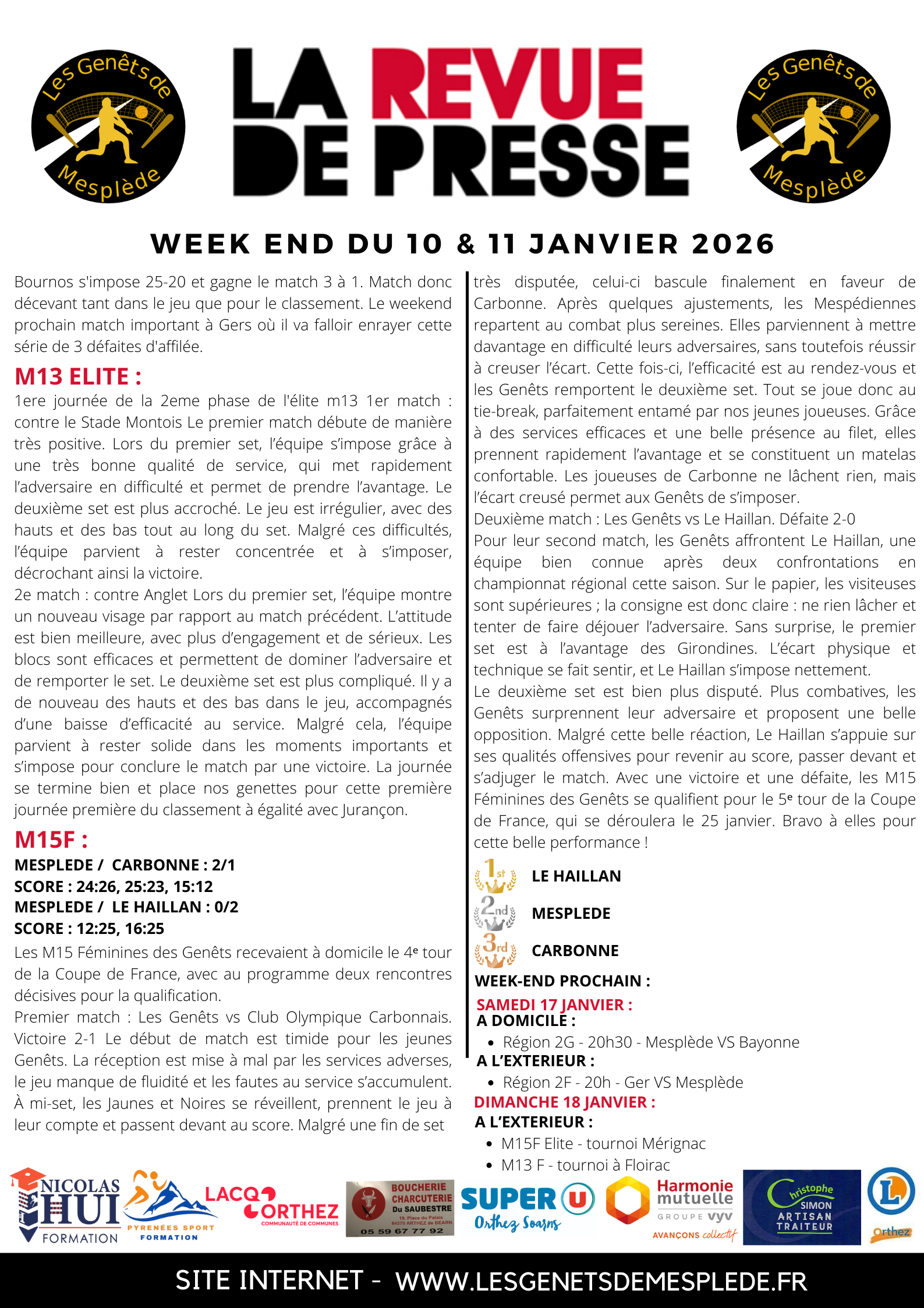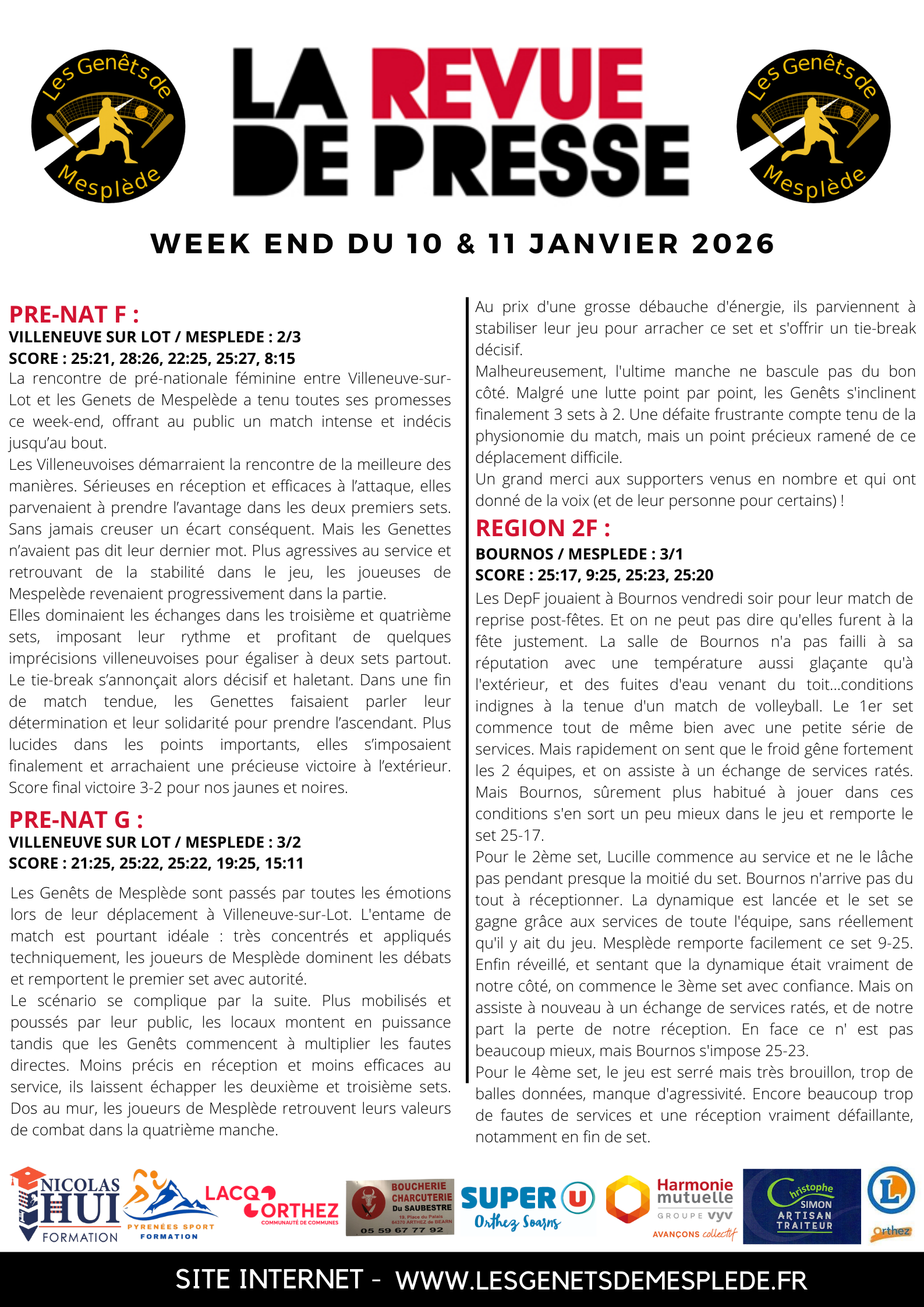 - Un grand bus a été loué pour le déplacement aux JSA de Bordeaux pour les deux équipes Pré-Nationale le 24 janvier.