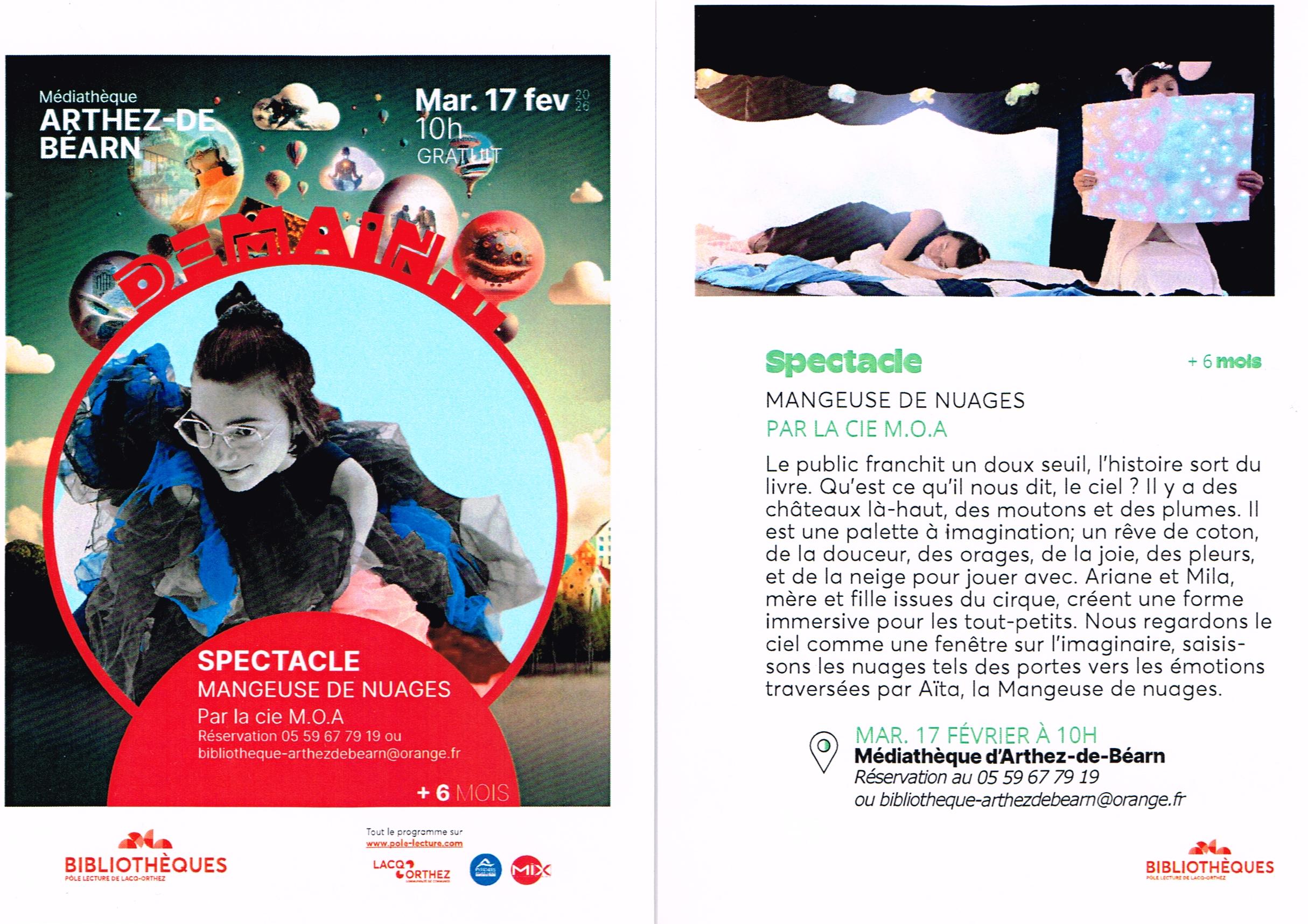 Le spectacle « Mangeuse de nuages », par la compagnie M.O.A., invitera les plus jeunes comme les plus grands, mardi 17 février à 10 heures à la médiathèque arthézienne, à regarder ce que dit le ciel, avec ses châteaux là-haut, ses moutons et ses plumes…