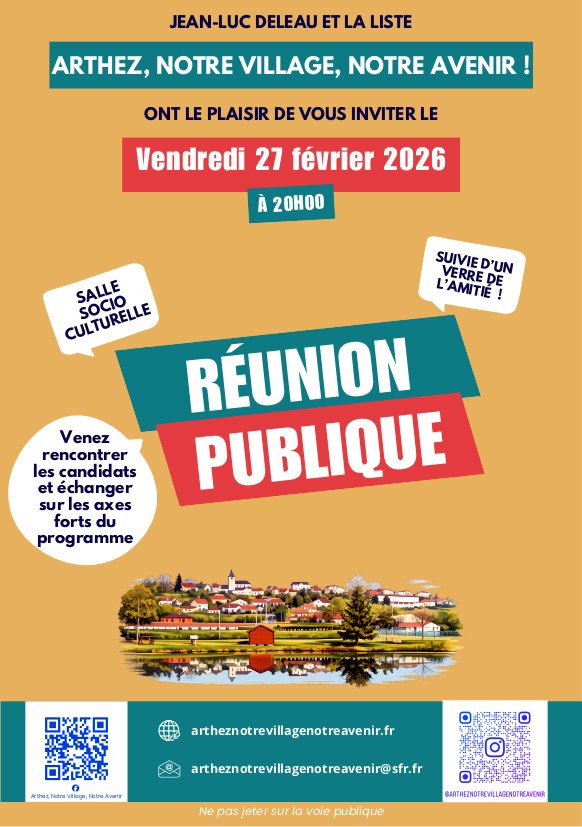 La liste « Arthez, notre village, notre avenir ! », menée par Jean-Luc Deleau, organise une réunion publique à l’Espace socioculturel le vendredi 27 février à 20 heures.