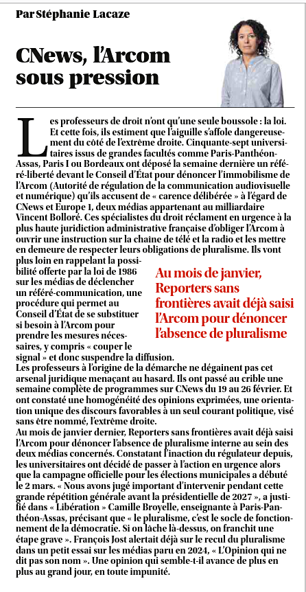 Selon les requérants (57 enseignants-chercheurs et praticiens du droit ), ces déséquilibres, signalés à plusieurs reprises, n’ont entraîné aucune réaction effective du régulateur. Dans leur référé, ils demandent au Conseil d’État d’enjoindre à l’Arcom de mettre en demeure les deux médias concernés et d’exercer pleinement ses pouvoirs d’instruction.