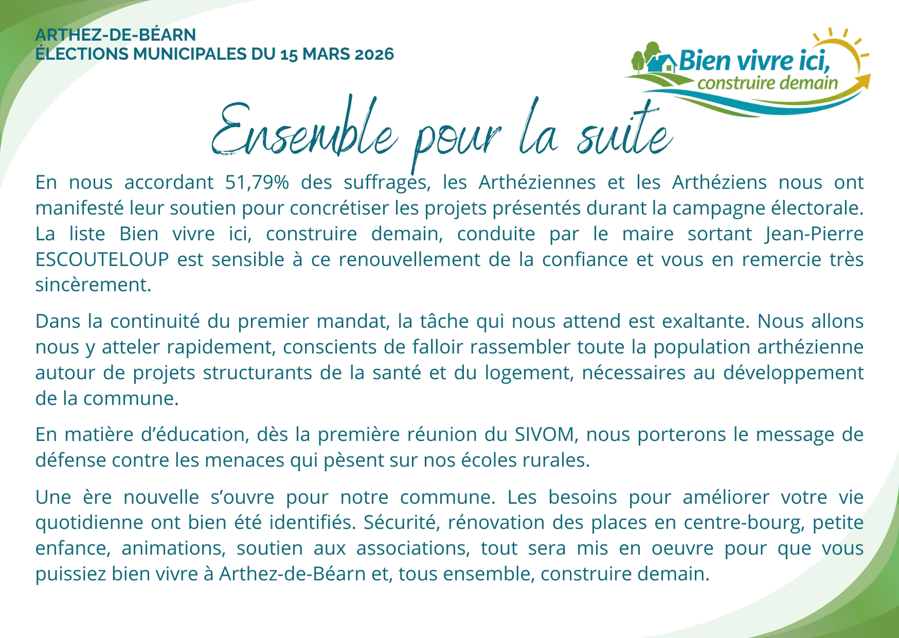 Pour notre part, l’engagement pour notre village ne s’arrête pas avec cette élection. Nous continuerons, chacun à notre place, à être attentifs à l’avenir d’Arthez et à défendre les valeurs qui ont guidé notre démarche.