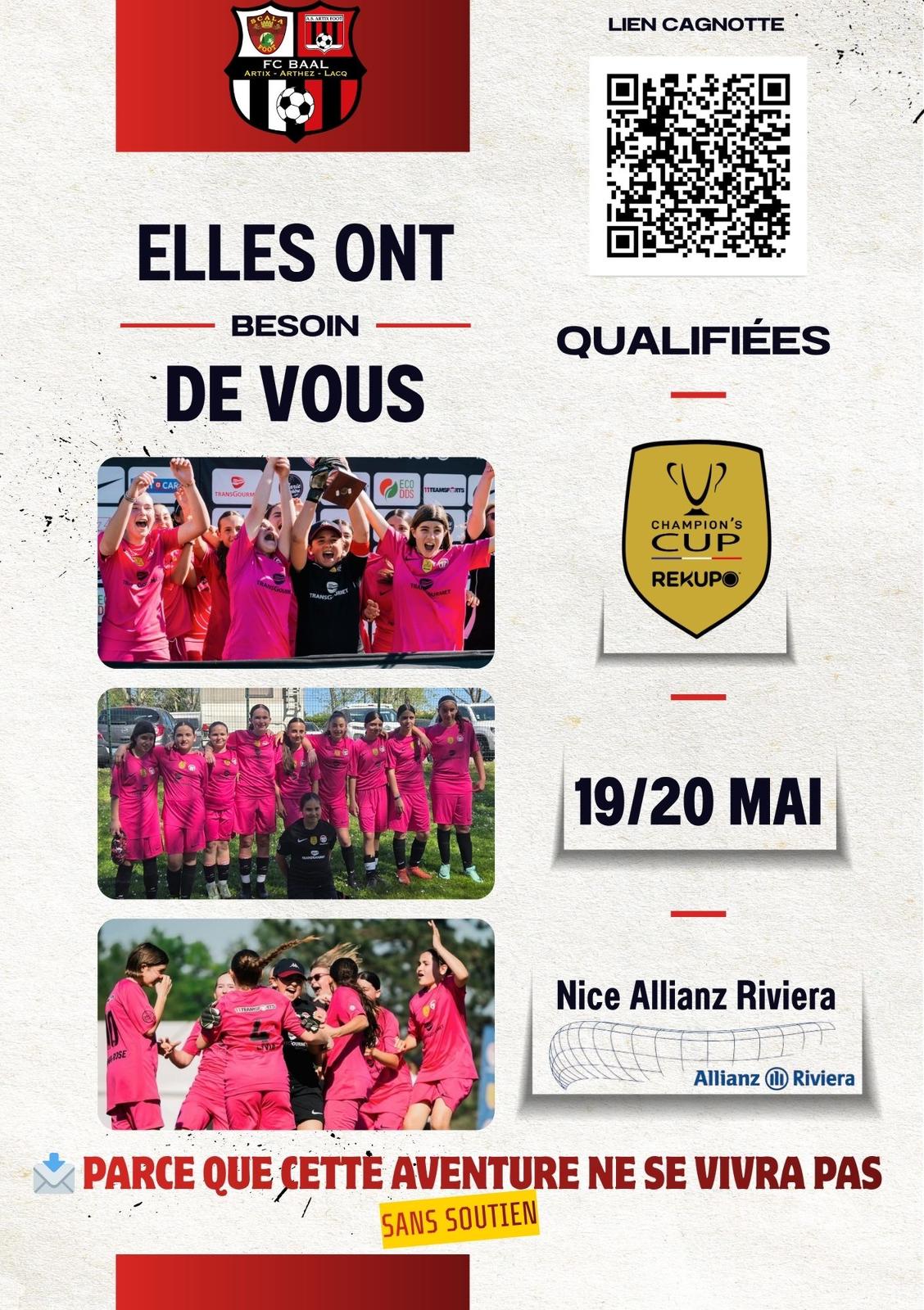 Les jeunes féminines U13 du FC BAAL ont réalisé un exploit en se qualifiant pour la phase finale de la Champion’s Cup Rekupo qui se déroulera les 19 et 20 mai dans le cadre prestigieux de l’Allianz Riviera de Nice.