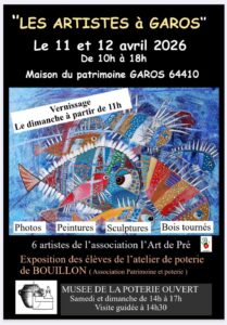La Maison du Patrimoine de Garos accueillera, samedi 11 et dimanche 12 avril, une exposition artistique de photos, peintures, sculptures et bois tournés, ouverte au public de 10 heures à 18 heures.