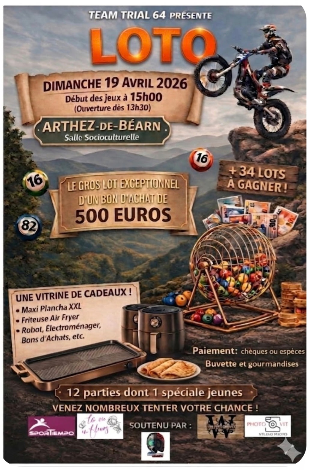La nouvelle association artéhzienne Team Trial 64, qui a pour but de soutenir les jeunes pilotes trialistes du secteur, organise un loto à la salle socioculturelle, dimanche 19 avril à 15 heures.