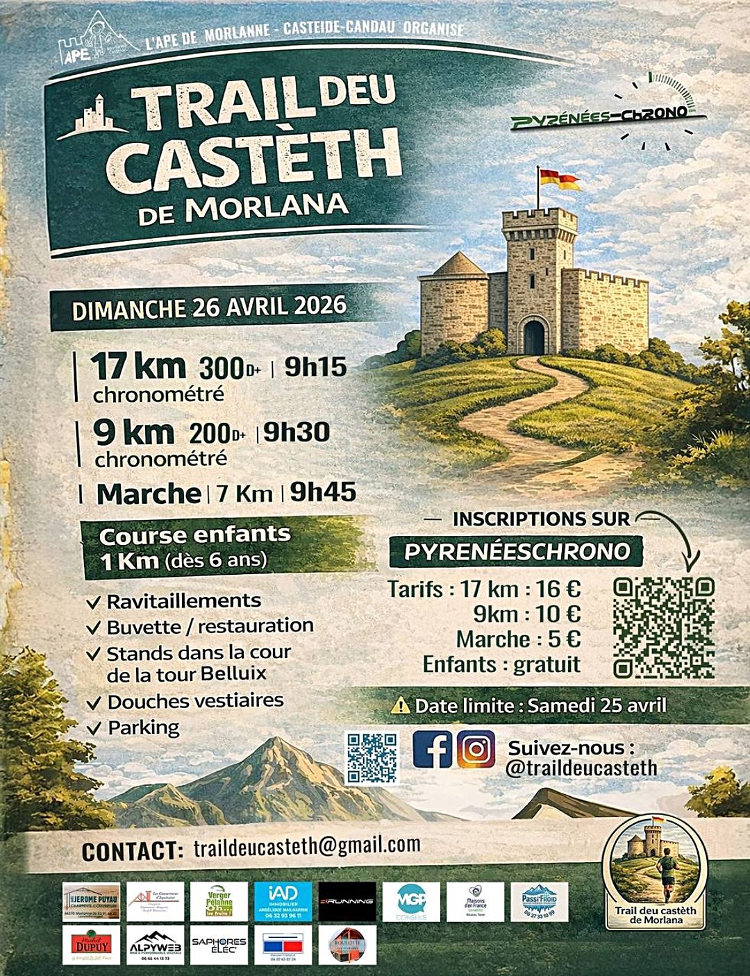 - Inscriptions jusqu’au samedi 25 avril au 06 31 74 24 25 et par mail : traildeucasteth@gmail.com